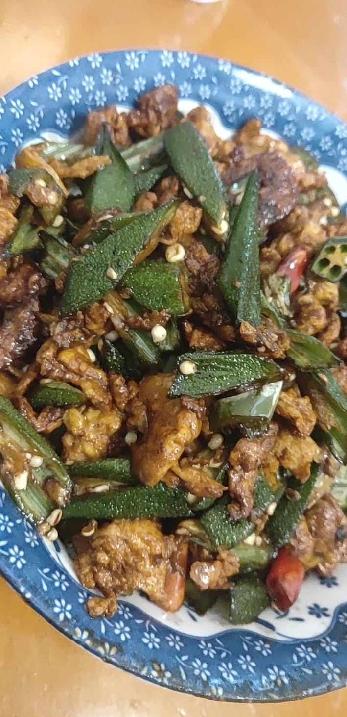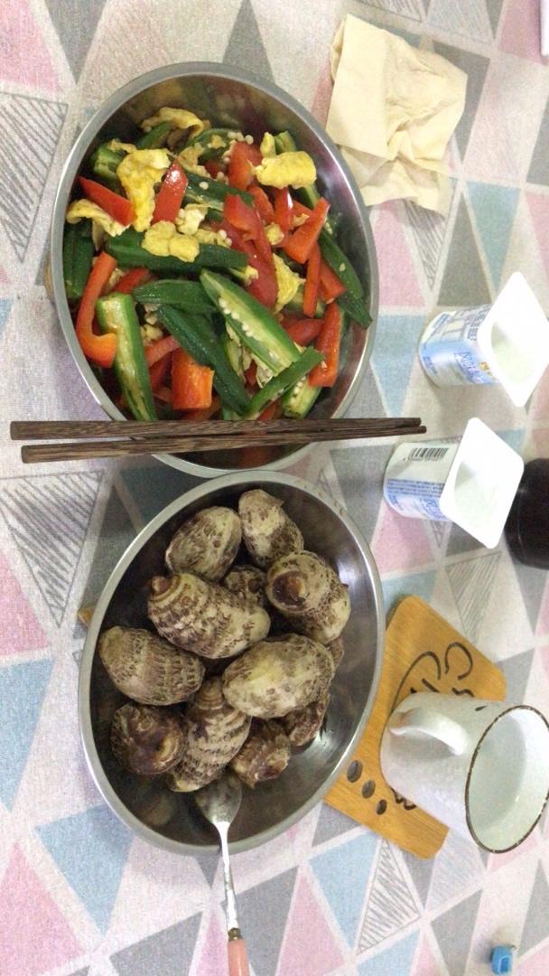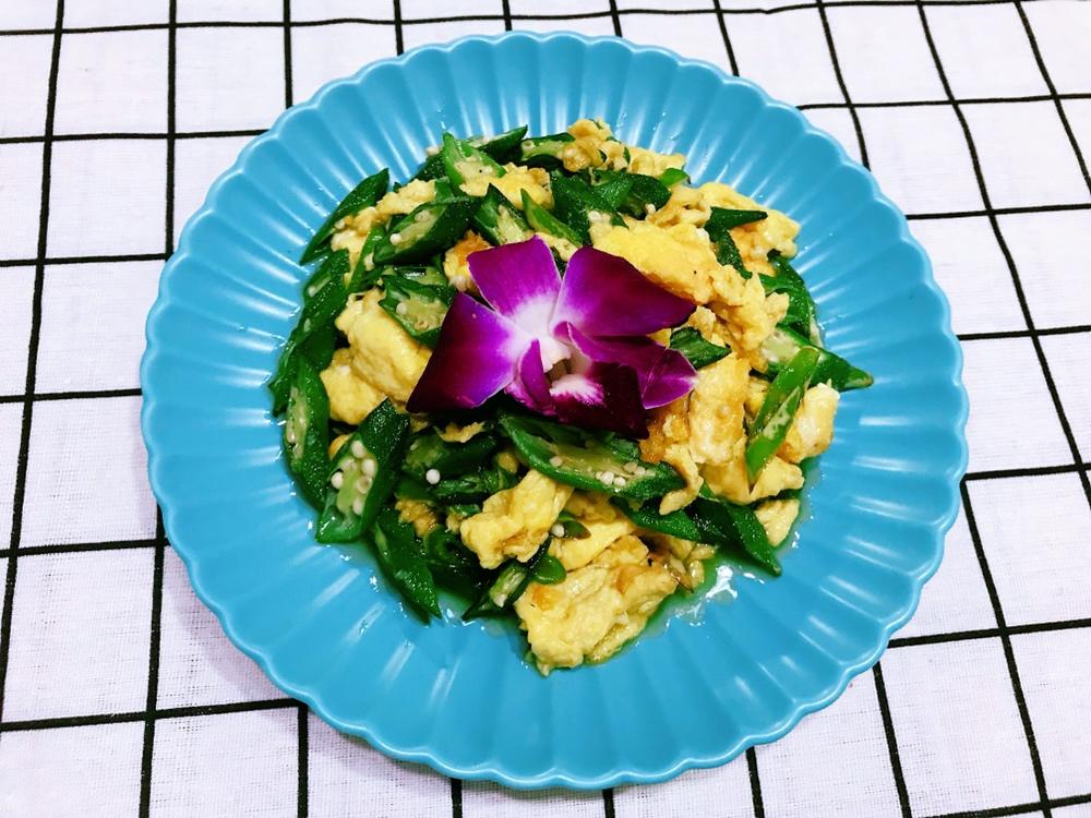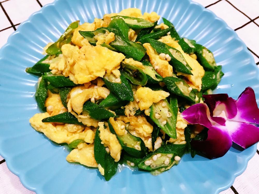 秋葵整个开水中小火过一分钟,鸡蛋炒嫩,炒:姜蒜,辣椒,秋葵,鸡蛋,葱