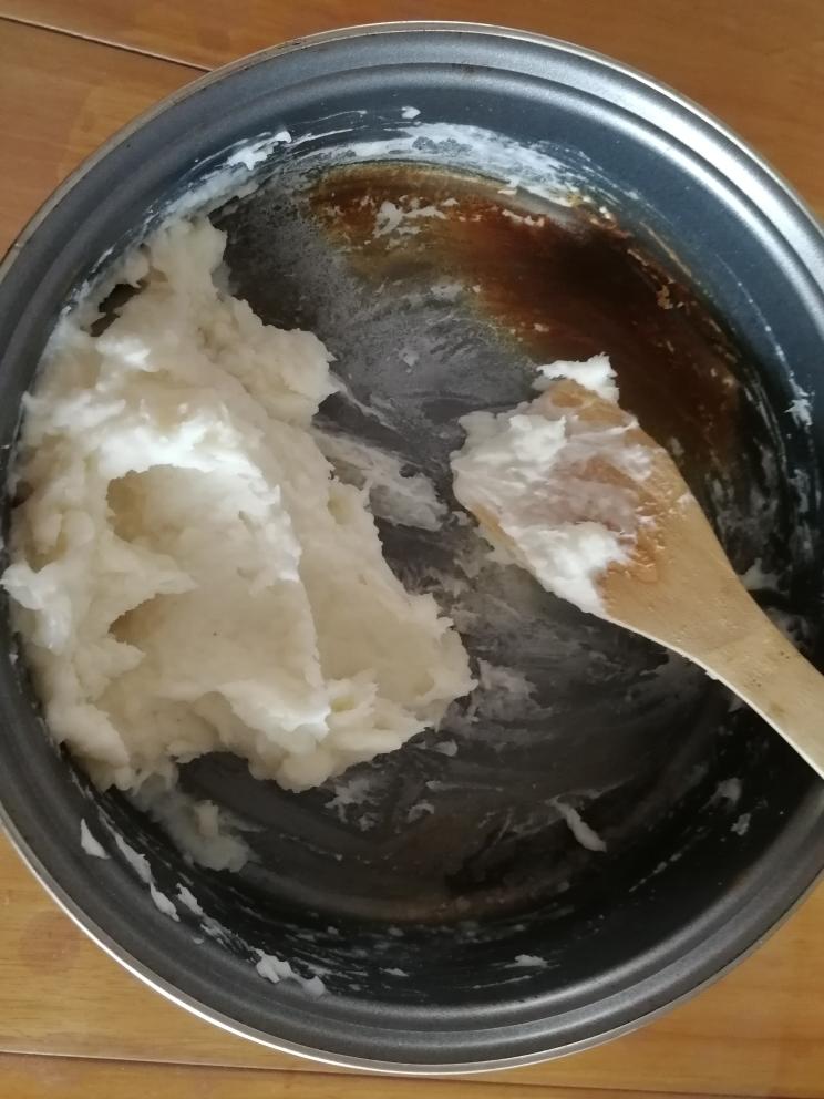 把捻好的山药泥倒入牛奶里,搅拌至看不到牛奶液,变成糊状关🔥。
