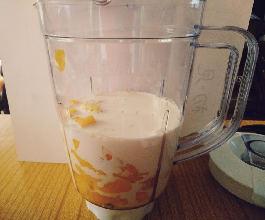倒入冷藏好的芒果牛奶🥛
