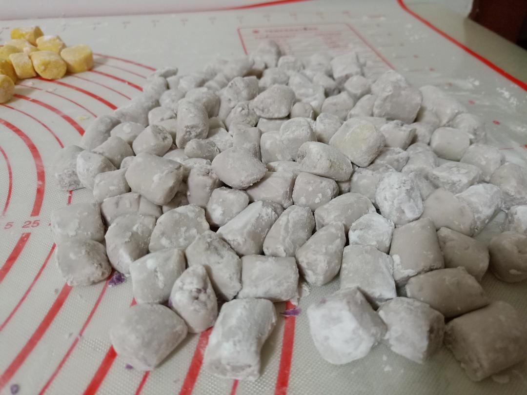 1.100克木薯粉是估计的用量,分次加入,知道可以成团就可以 2.如果合团过程中太干,也是少量加水,慢慢的和成团 3.紫薯捣泥时,加入几滴柠檬汁可以起到控色作用,煮的时候不掉色