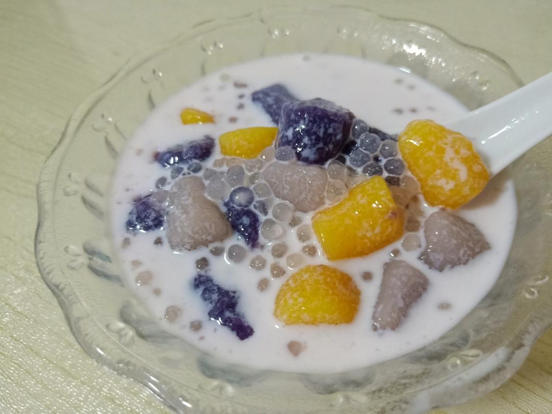 水烧开下入三色芋圆,煮到漂起就熟了,喜欢吃甜的,淋上一些炼乳,或者加蜜豆,加上煮好的西米露,倒入牛奶即可