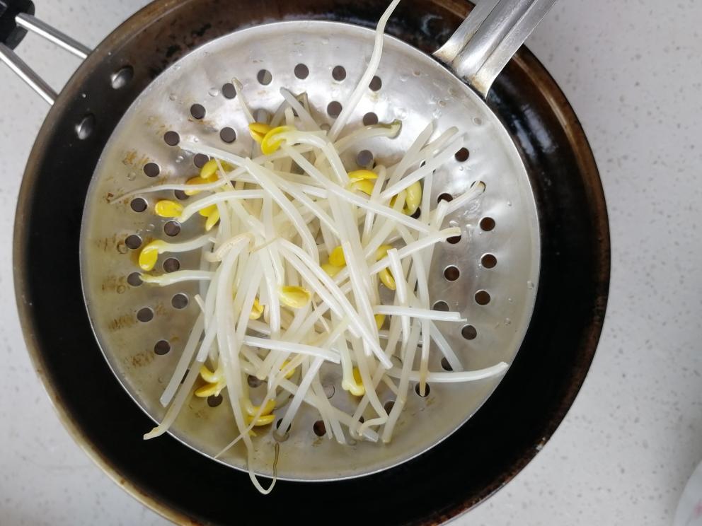 黄豆芽在水里煮熟,捞出沥水。