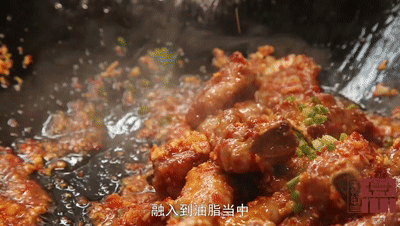 ✔ 锅烧热,在锅中多加一些油,将排骨下锅油炸过油,炸至肉缩时就倒出多余的油(锅里留底油),然后下泡椒末、姜蒜米、葱花翻炒出香。