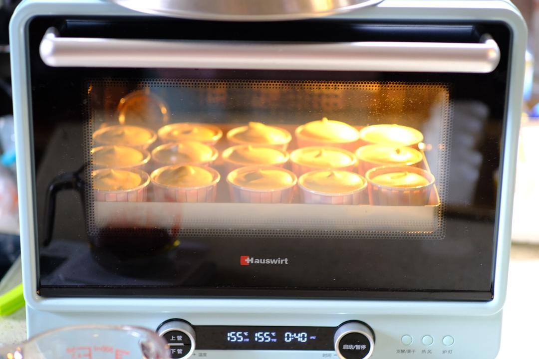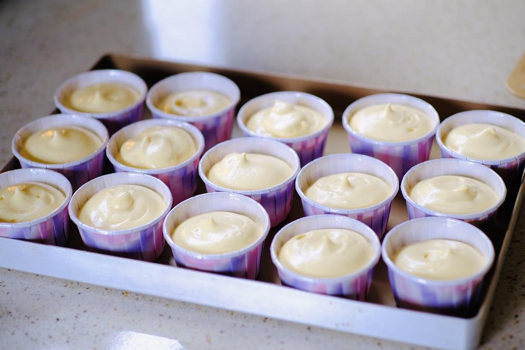 将面糊 装入杯子蛋糕。装好后轻震几下。