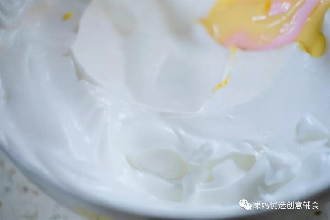 取一部分蛋清泡 放入蛋黄糊中搅拌均匀。可以用炒菜的翻拌手法 也可以用正常搅拌的方法