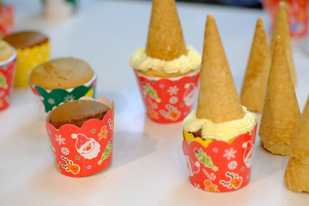 开始裱花啦 黄油和奶油奶酪 提前5小时取出软化 到手指轻戳可以出坑 。然后将黄油和糖粉放入盆中打蛋器高速打发 颜色变白体积膨胀。期间少量多次放入柠檬汁。接着放入奶油奶酪 持续高速搅打 直至整体体积膨胀 颜色接近白色 非常细腻柔软的状态。最后 调色后 分别装入裱花袋裱花嘴进行裱花 杯子戚风蛋糕面上铺一层白奶油,然后插一个倒立的蛋筒