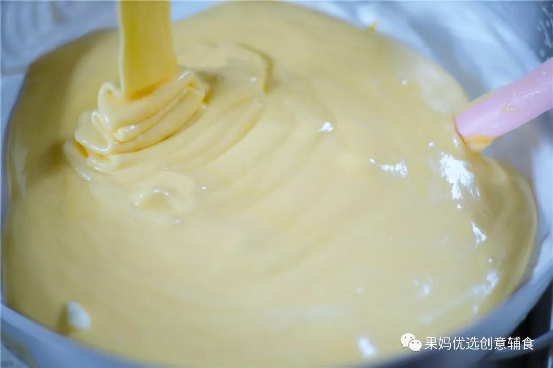 搅拌成光滑的程缎带留下的蛋黄面糊 只要均匀就行 搅拌手法不限但别过度搅拌