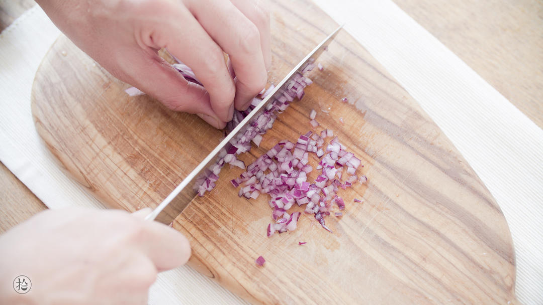 15g洋葱切成细丁。 洋葱的辛辣味道可以帮助去腥,还可以加一点姜葱末,进一步去除肉中的腥味。