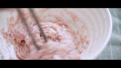 搅拌至肉馅吃水上劲,搅拌起来很困难的程度。