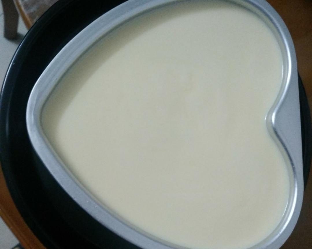 将混合液倒入烤盆,震出气泡,用另一个烤盆呈着,盆里加入二分之一热水,采用水浴烤法