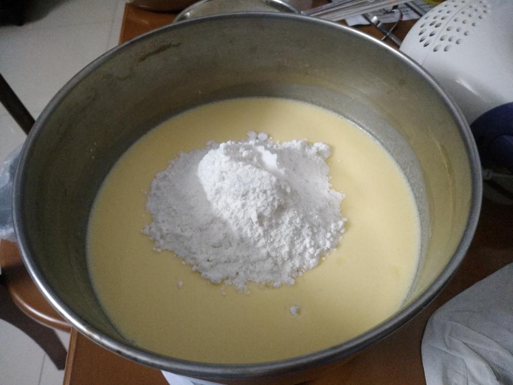 然后加入低筋面粉和玉米淀粉,搅拌至无颗粒状备用