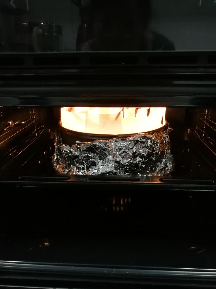 烤盘加水,八寸模具坐里面(水浴法)专业烤,上下火150°,60分钟