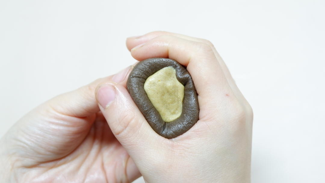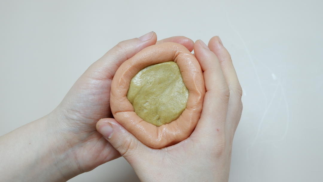 采用一部分油皮部分加入少许可可粉,三份面团备置完成;