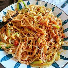 做调料汁时蒜炒黑了,酱油醋也放少了,所以最后拌面条时又加了一些生抽和醋。如果一次放够,可能味道会更好。另外没来得及把炒好的花生碾碎。下次会做的更好!😊