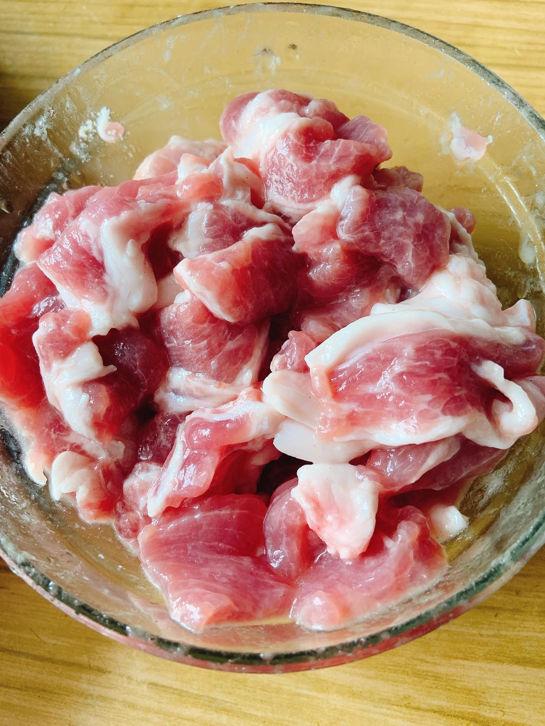 肉片加少许盐、淀粉、胡椒粉腌制。