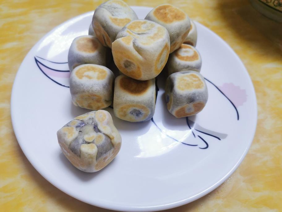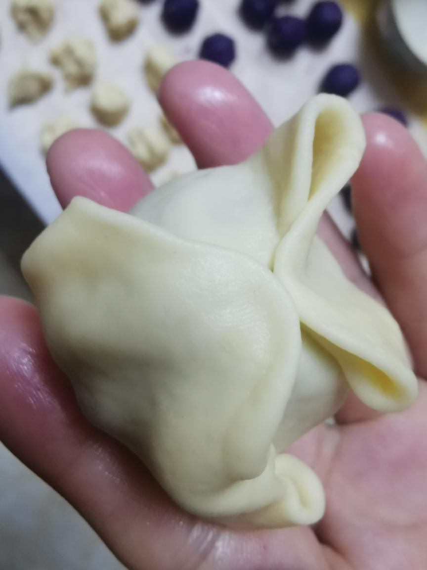 像擀饺子皮一样,中间厚,四边薄,包入紫薯夹心球(像包包子一样,然后滚圆)