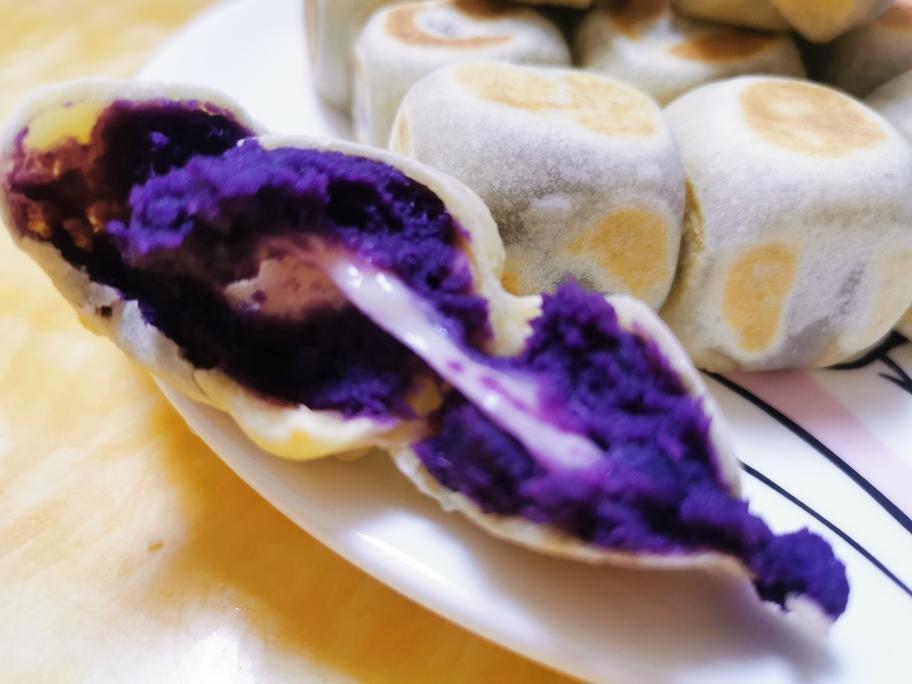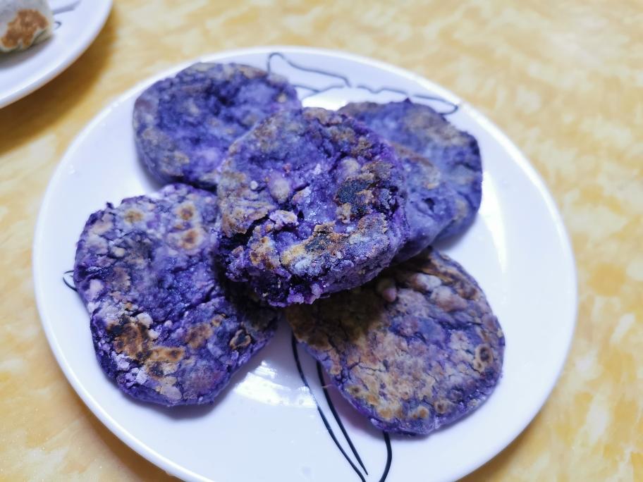 紫薯饼: 紫薯360克加砂糖加淡奶加奶粉拌成紫薯馅,然后分成揉成60克大小的团,压成饼状。 准备盆放入150克糯米粉,另外准备一盆水。 紫薯饼放入糯米粉中,正反两面跟边边沾上糯米粉。 然后过一下水,再放入糯米粉中沾上粉就可以放锅子煎了。