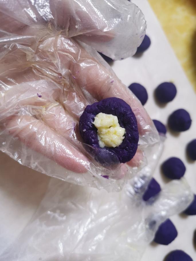 将芝士放入紫薯中包成夹心球。