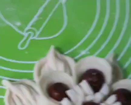 取4个20克左右的面团搓成长条,用叉子按出纹路,盘成一圈包住一个红枣,按图放在空闲位置。