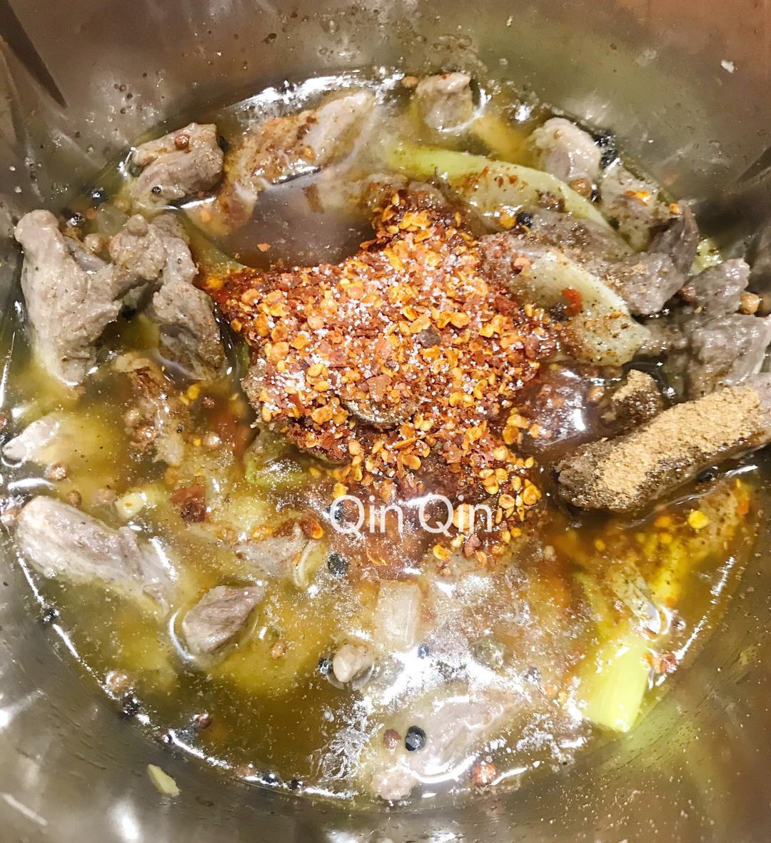 主锅油爆香后,加入焯过水的牛肉500克、生抽30克、老抽5克、冰糖10克、干辣椒面10克、五香粉5克,设置20分钟/V档/反转小勺。
