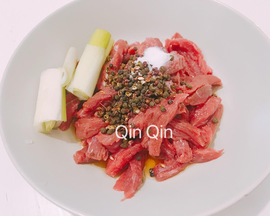 先把牛肉切条,加入所有腌肉的调料,拌均匀腌20分钟。