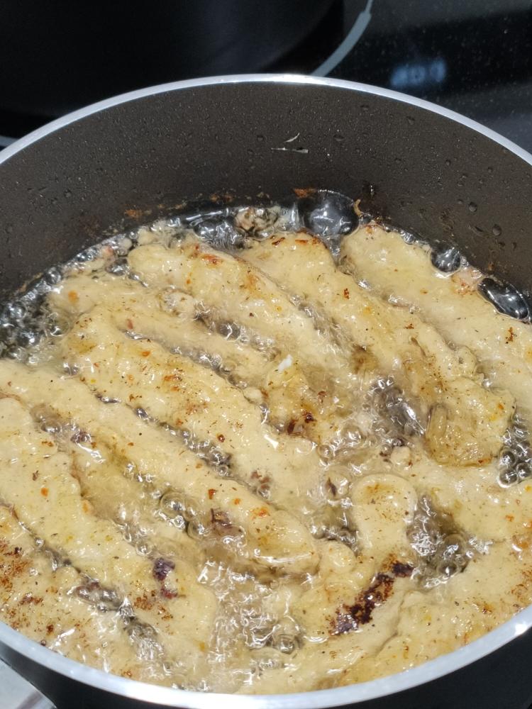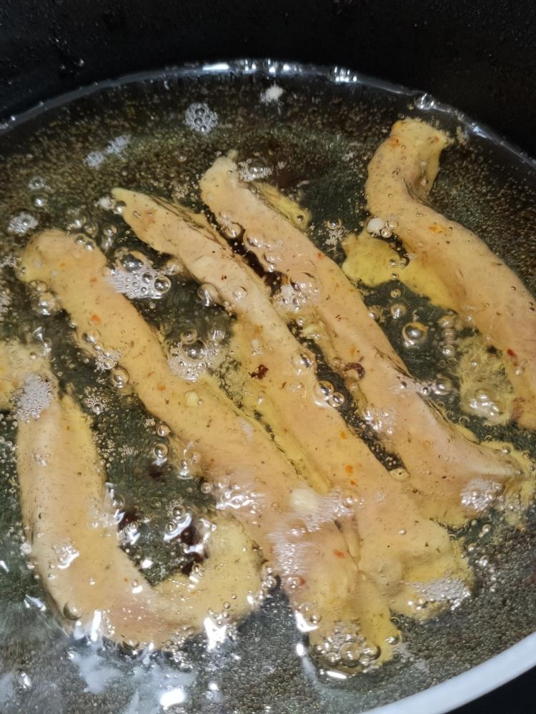 油温60,就是冒小泡,肉下锅炸,开小火,肉一条一条放入,避免粘在一起