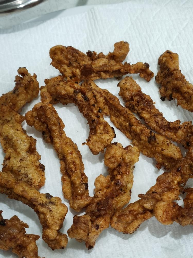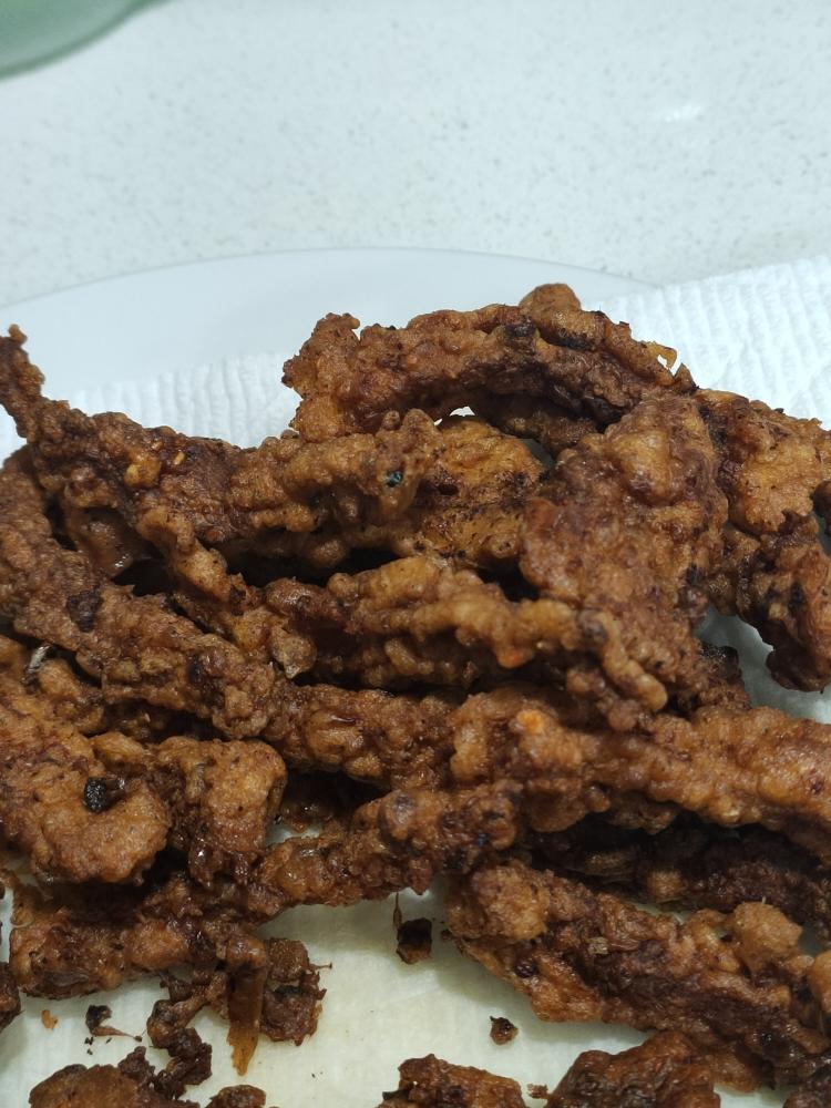 油高温大火,再下油锅复炸大概2分钟,捞出。好了,开吃。