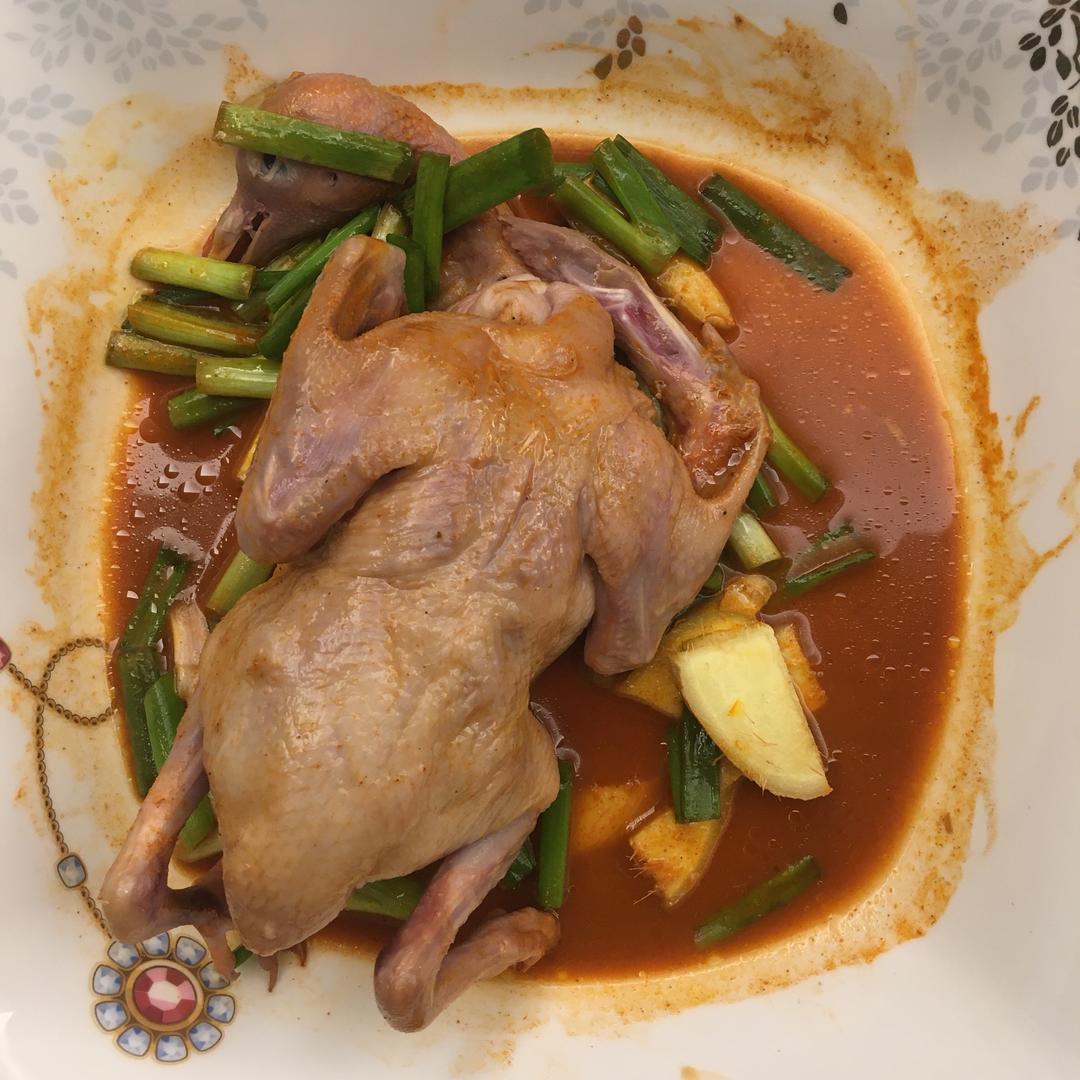 葱段、姜片、料酒、生抽、色拉油涂在乳鸽身上,
