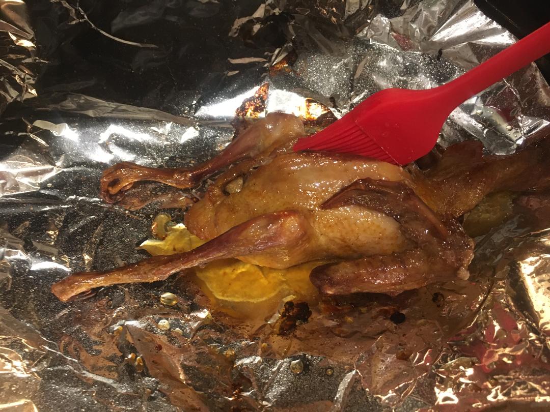 烤完20分钟,拿出来,全身刷上蜂蜜,再放入烤箱烤10分钟后,即可出炉。 (你也可以烤5分钟出来翻面,再刷上蜂蜜,再烤5分钟)