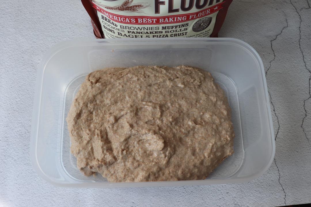 200克全麦粉和220克冰水一起搅拌均匀,放发酵盒中入冰箱冷藏一晚