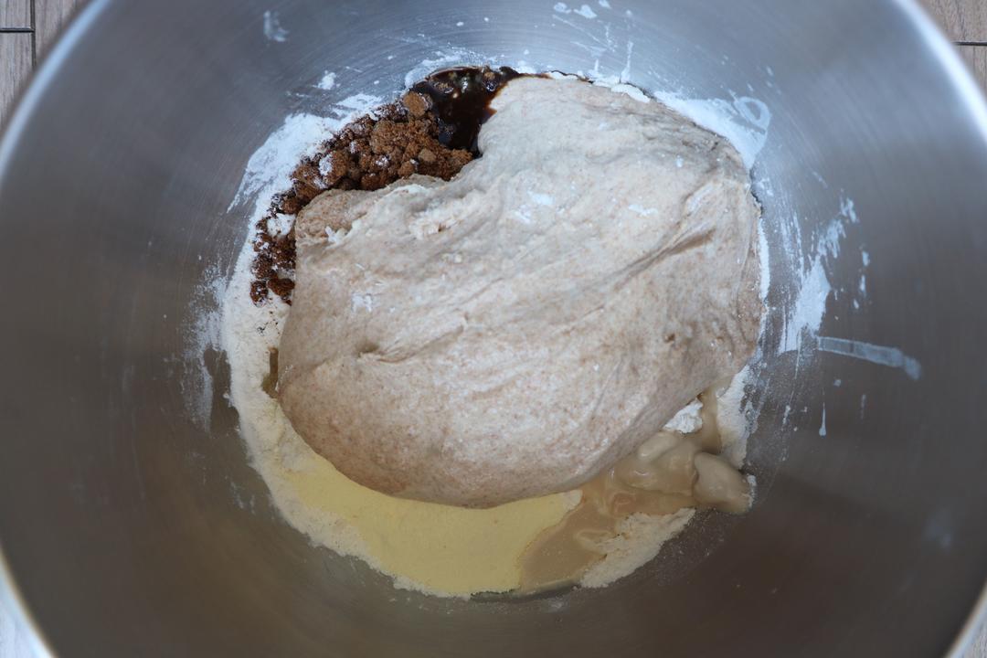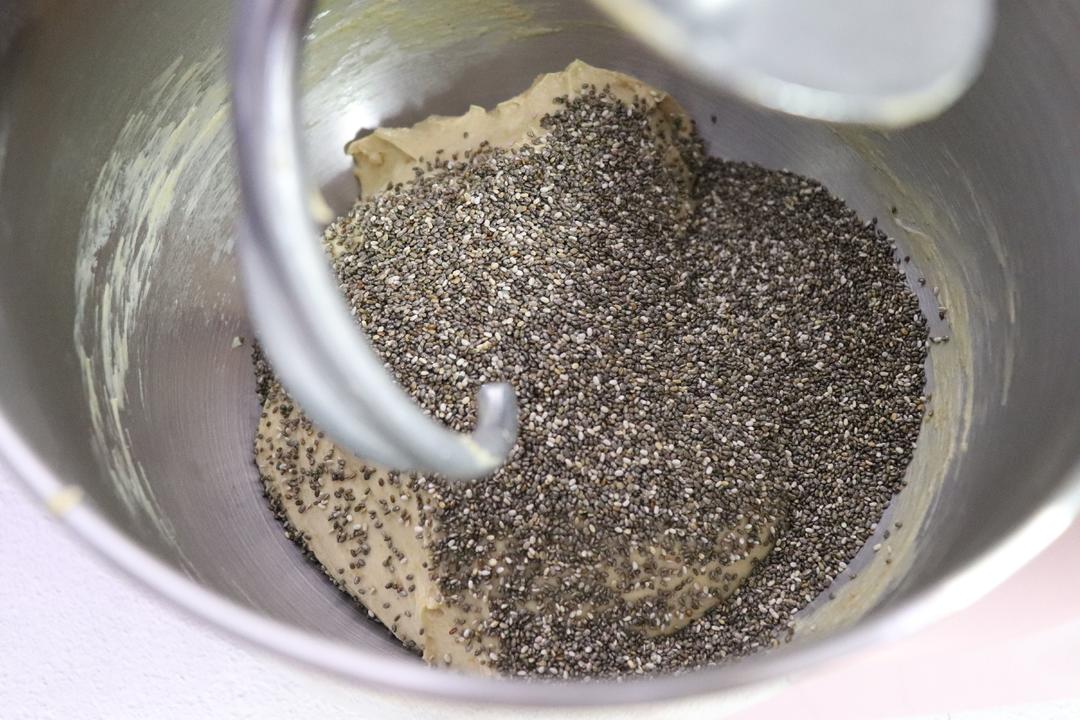 除黄油和奇亚籽外的所有材料放入厨师机,包括泡好的全麦粉。先放110克水,预留20克水看状态添加