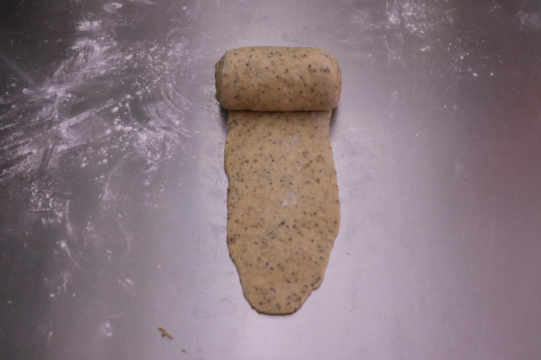 取一个面团擀成牛舌状,翻面从上向下卷好