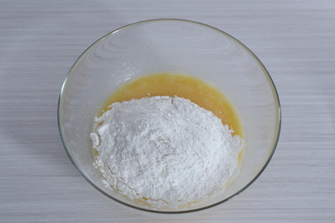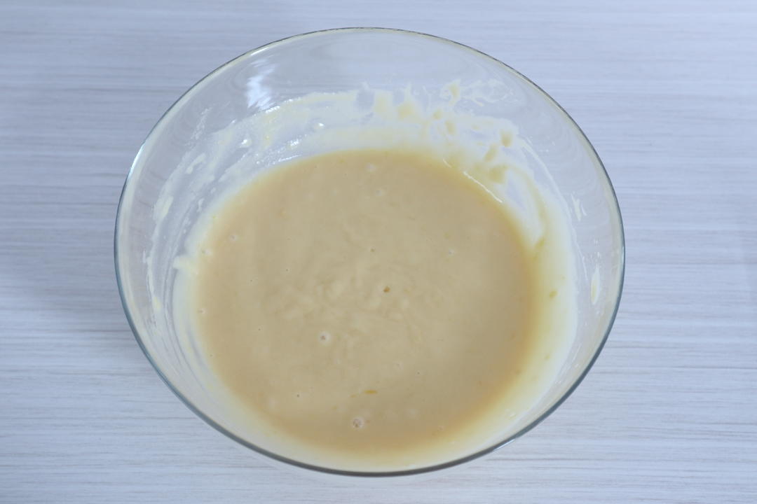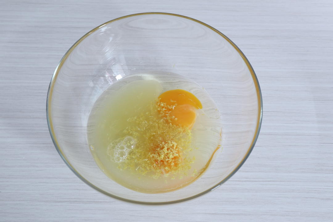 蛋液与细砂糖、柠檬汁、玉米油、柠檬皮屑混合,用蛋抽搅拌至细砂糖融化,且蛋液略微发白。
