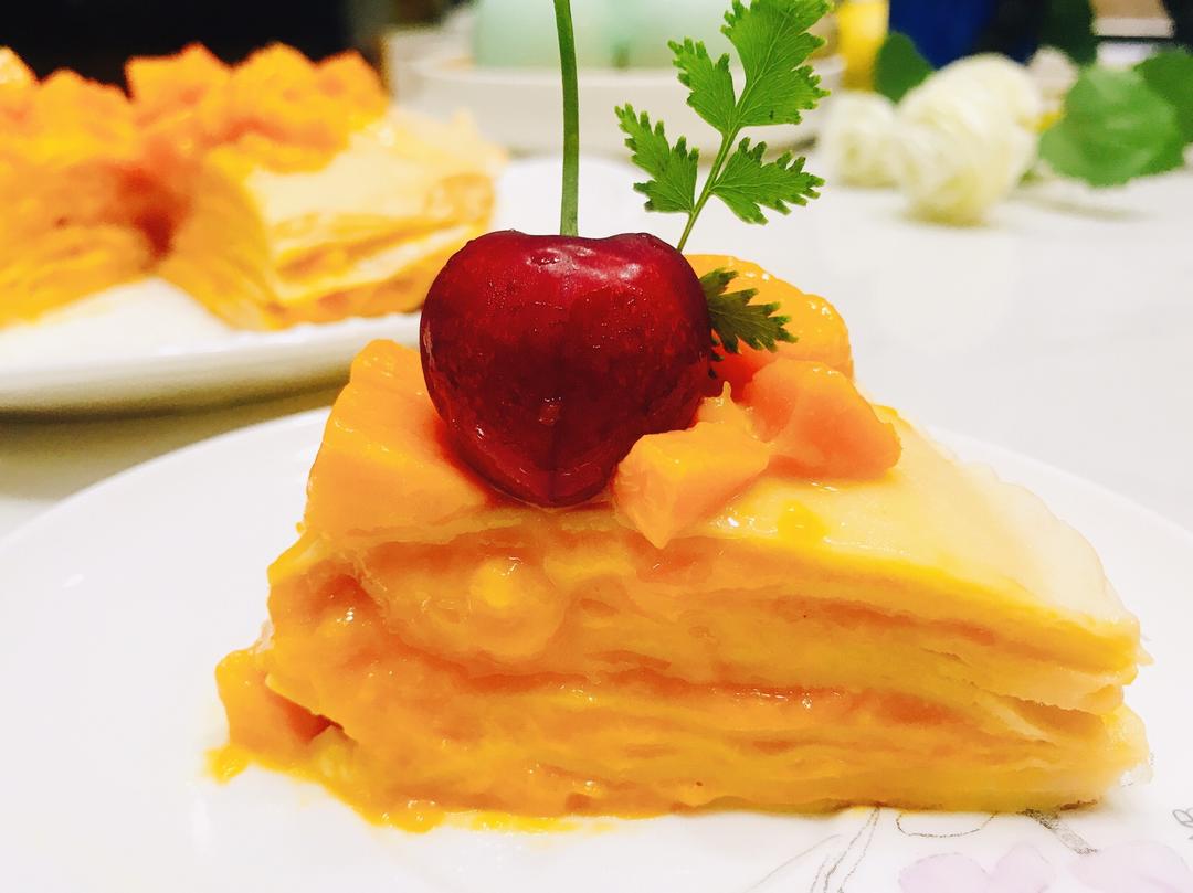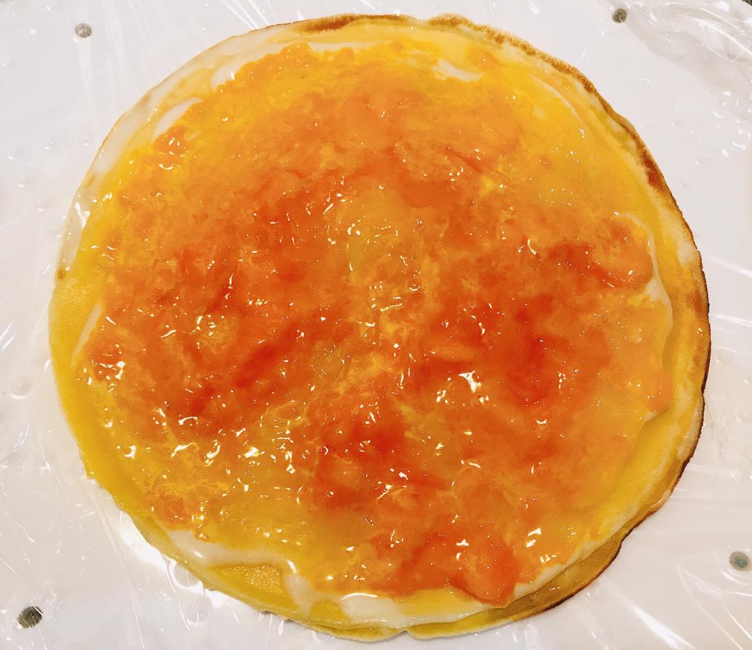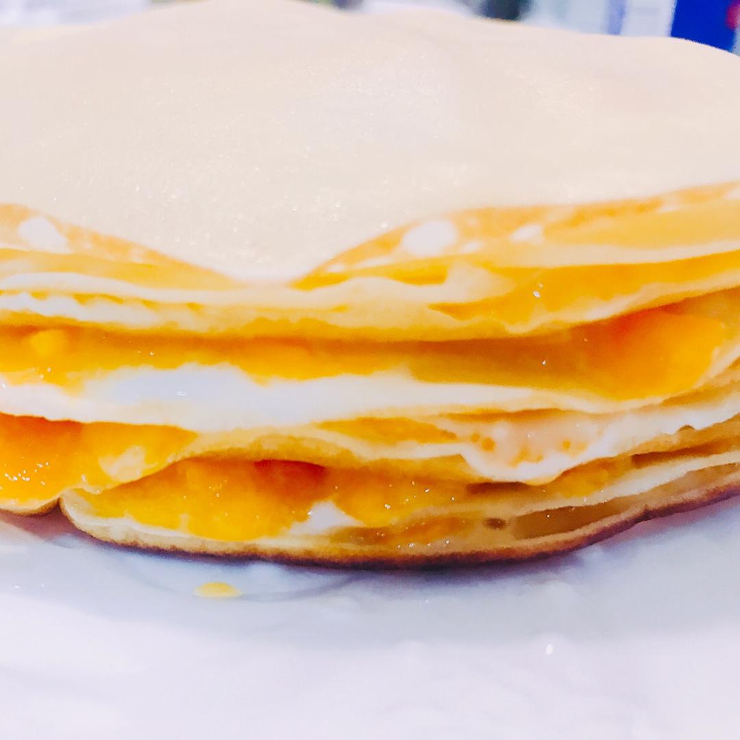 一层饼皮,一层酸奶,一层芒果泥粒,反复叠加;