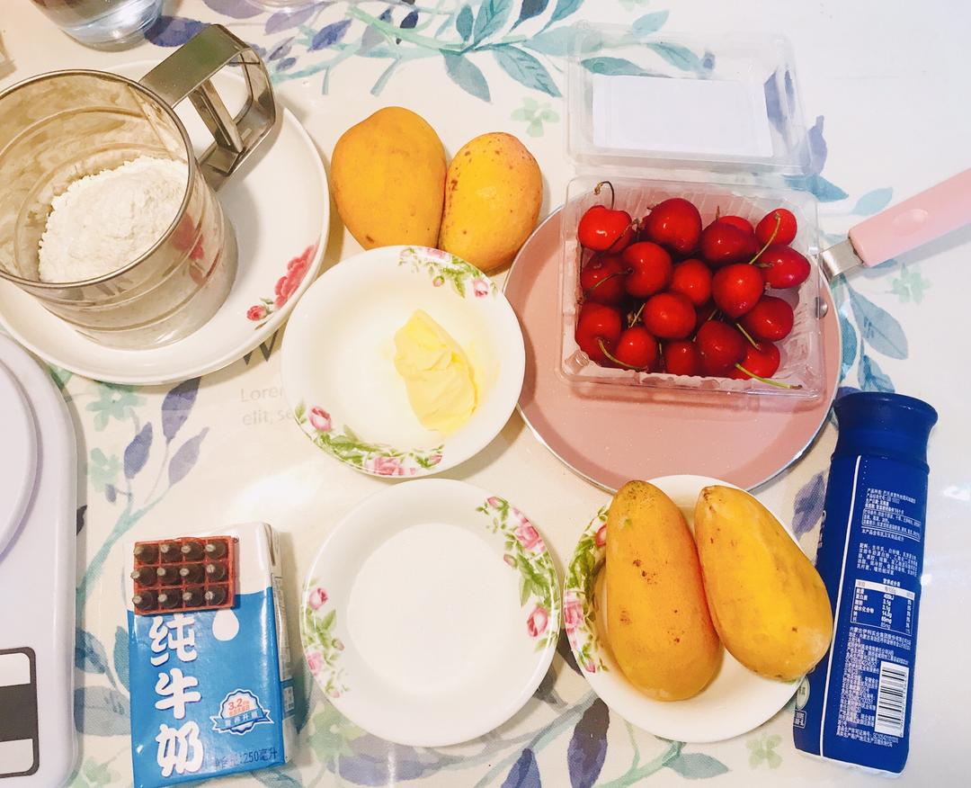 材料大集合:低筋粉、黄油、鸡蛋、牛奶、细砂糖,芒果(切粒略搅拌成泥粒状)、酸奶。