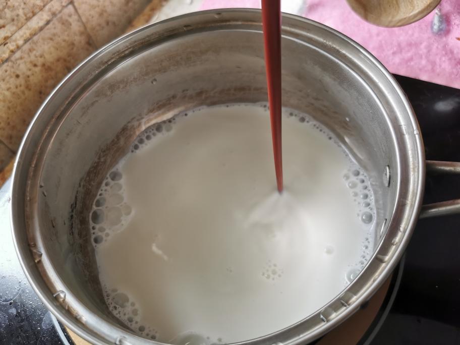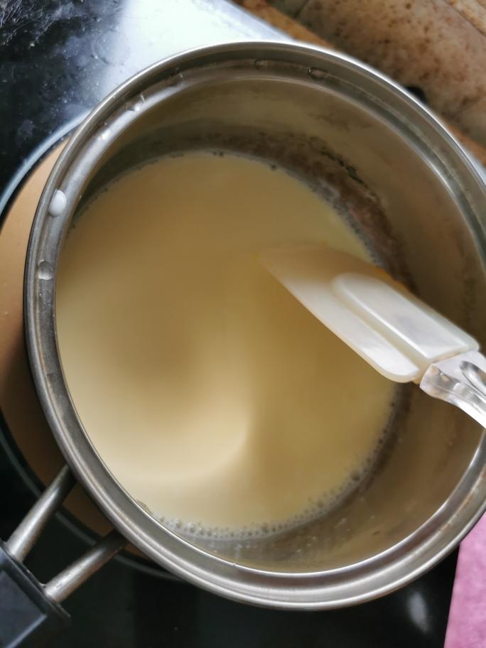 锅里还剩一点奶的时候,把混合的蛋液倒回锅里,小火煮,不要煮沸,依旧是冒泡关火