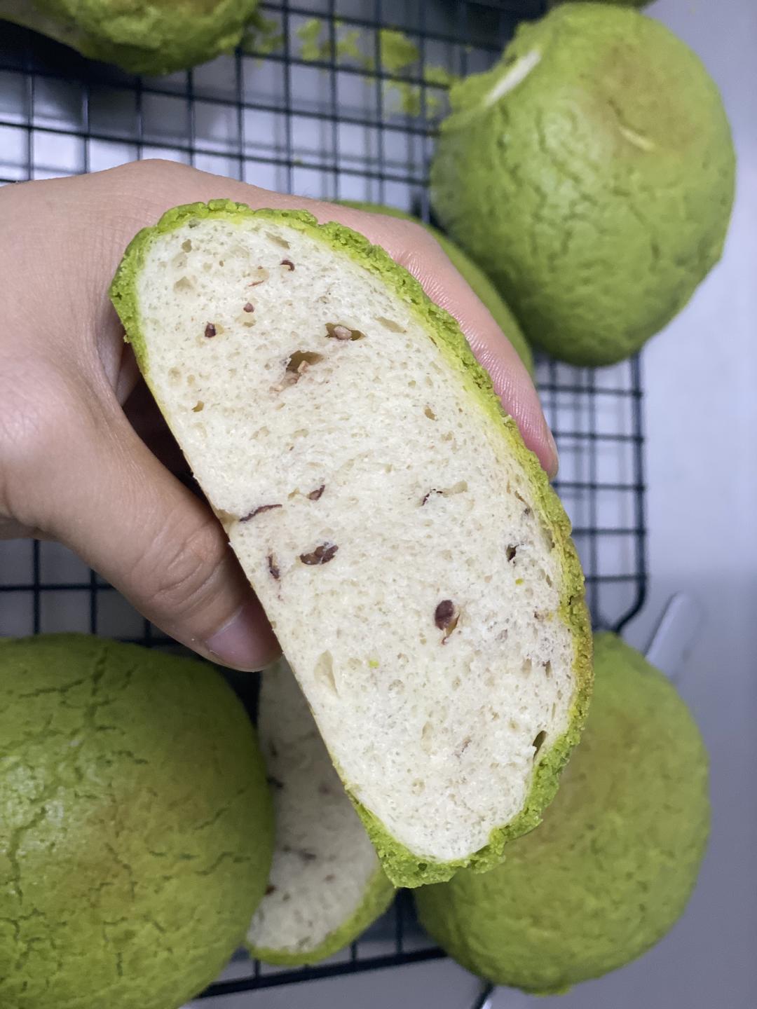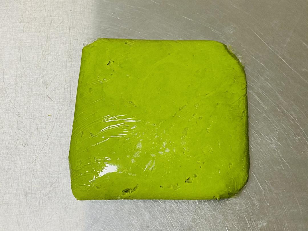 菠萝皮面团均分9份,取一个搓圆压扁在保鲜膜上