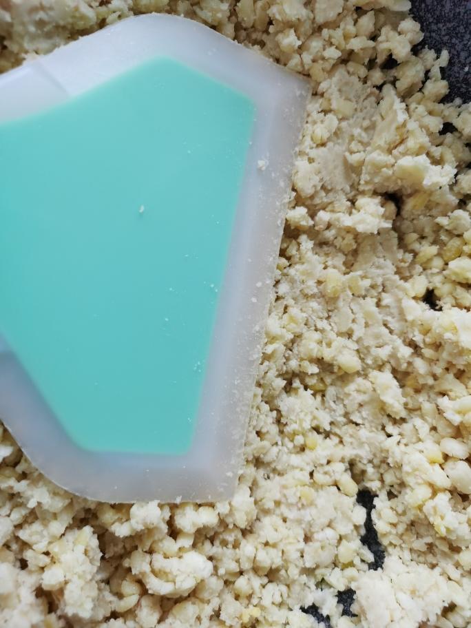 用平铲不断的翻拌按压混合均匀,绿豆泥成团即可。