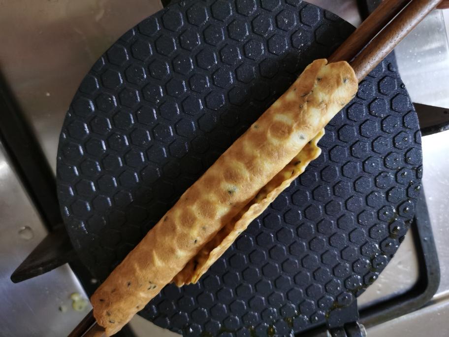 放下模具上片,上下片用力压合一下,这样可以薄一点。这时打开可以看到蛋卷胚基本成型,这时候饼胚是很软的,可以用筷子随时调整位置。
