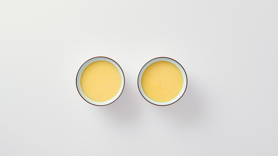 将全蛋液倒入2个蒸碗中,每个都倒到距离顶端1 cm处,盖上蒸碗盖。