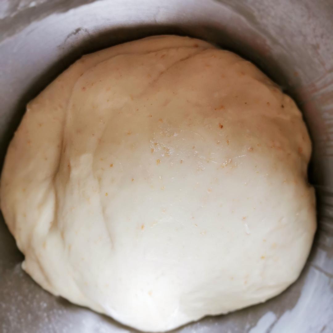 再加入260g高筋面粉、3g全麦麸皮及4.5g耐高糖酵母。(啰嗦几句:全麦麸皮是小麦最富含粗纤维的部分,包含了小麦胚芽,十分有营养而且可降低食物的GI值。如果没有,那就把高筋面粉降为180g,再添加80g的全麦面粉,为什么不能直接用全麦面粉呢?因为全麦粉中的麸皮会阻断面筋的形成,无法出坚韧的手套膜,导致了后期面包就不会很松软。)