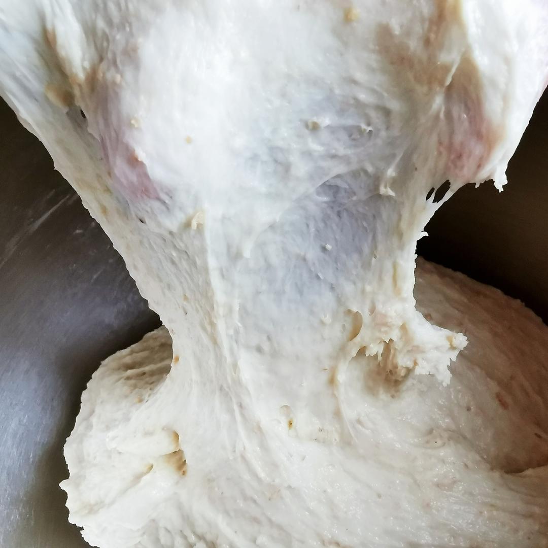 言归正传,把所有的配料都加进去以后就直接启动厨师机就可以了,大约揉了18分钟左右就可以出不太坚韧的膜了(加了麸皮,是出不了坚韧的手套膜的)。