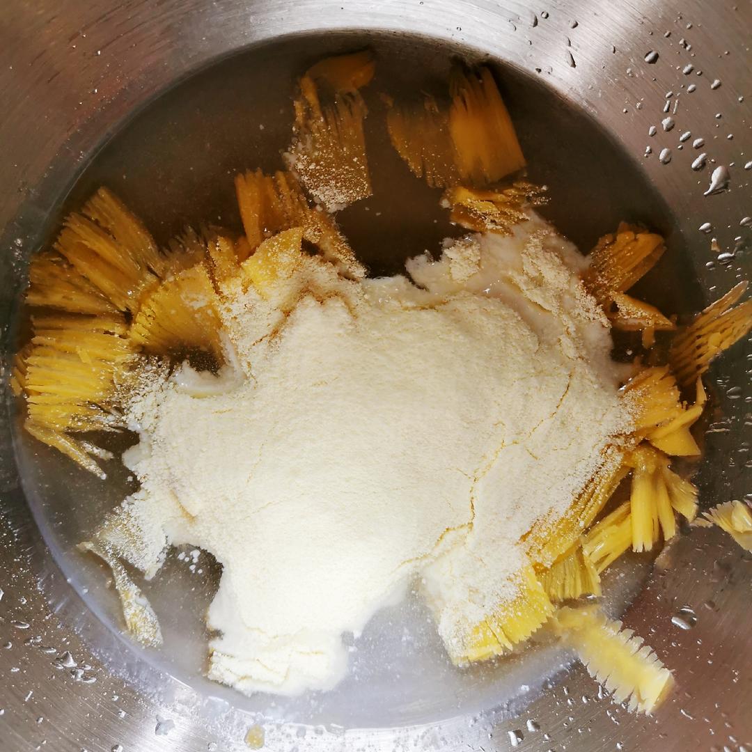 厨师机面桶中依次加入150g清水、15g黄油、65g赤藓糖醇、2g盐、12g全脂奶粉。(照片中看起来量很多,是因为我这次做了两个面包。)