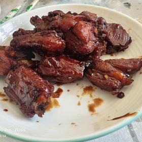 颜色有点儿深了,但果然好吃😋啊!跟红烧味儿完全不一样!酱香浓郁,外酥里嫩,甜香,不愧是闻名远扬的无锡酱排骨