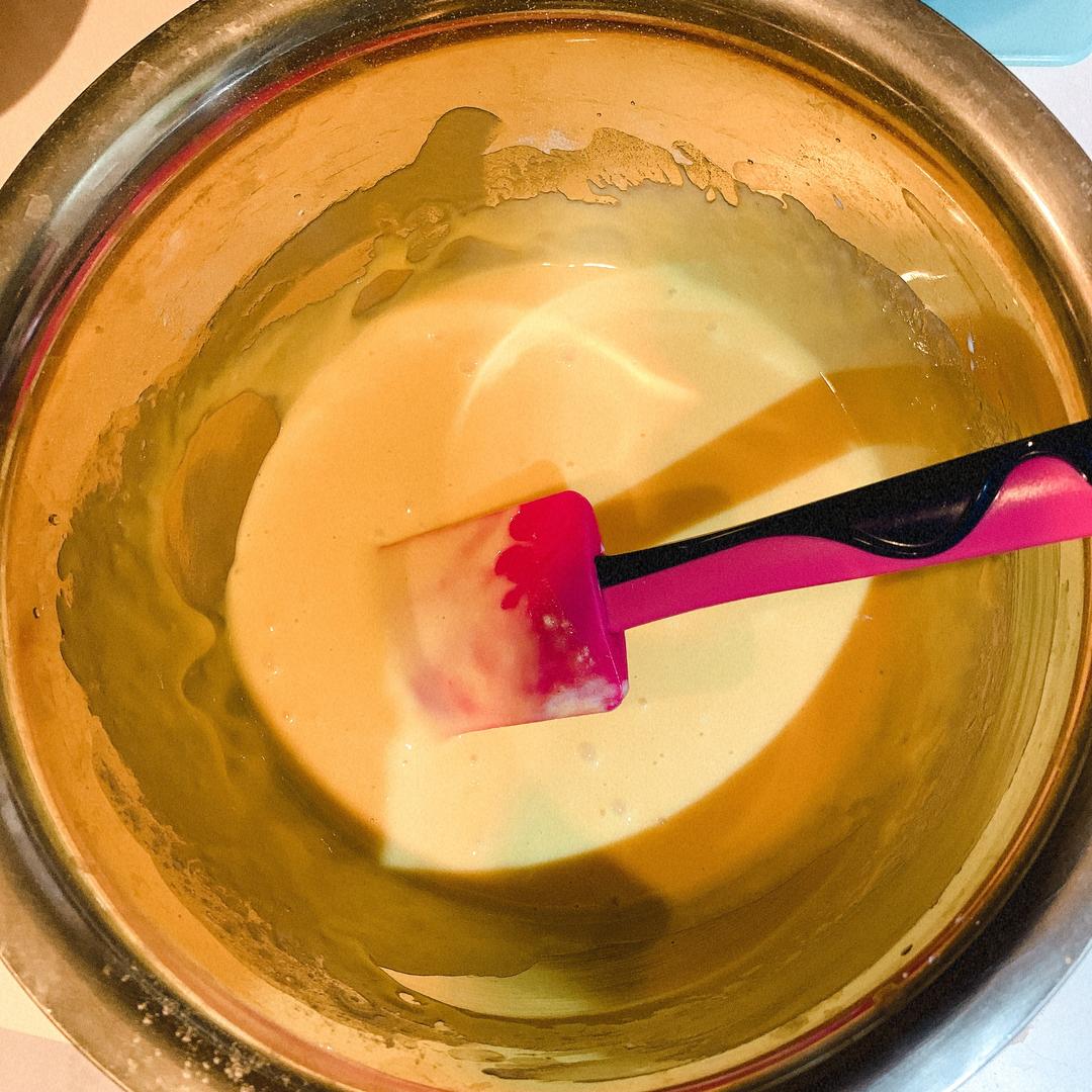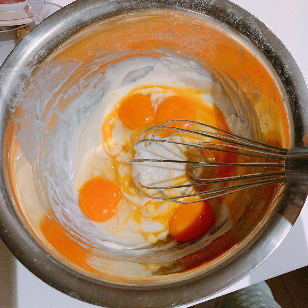 倒入牛奶搅拌,再放入四个蛋黄一个全蛋搅拌