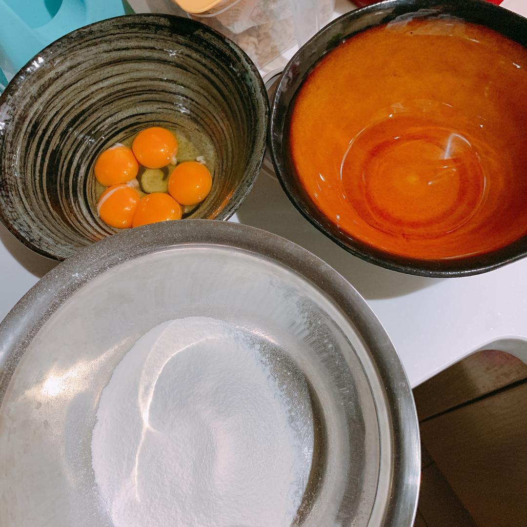 事先分好各种材料,低筋面粉提前过筛。玉米油放微波炉高火一分钟,或明火加热出现油丝。缓慢倒入过筛后的低筋面粉中,充分搅拌。