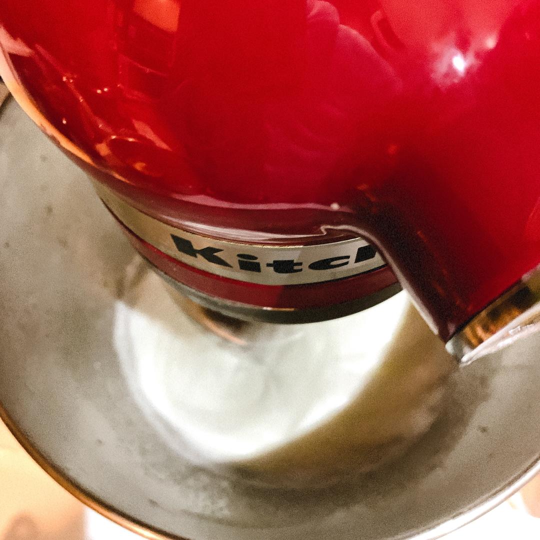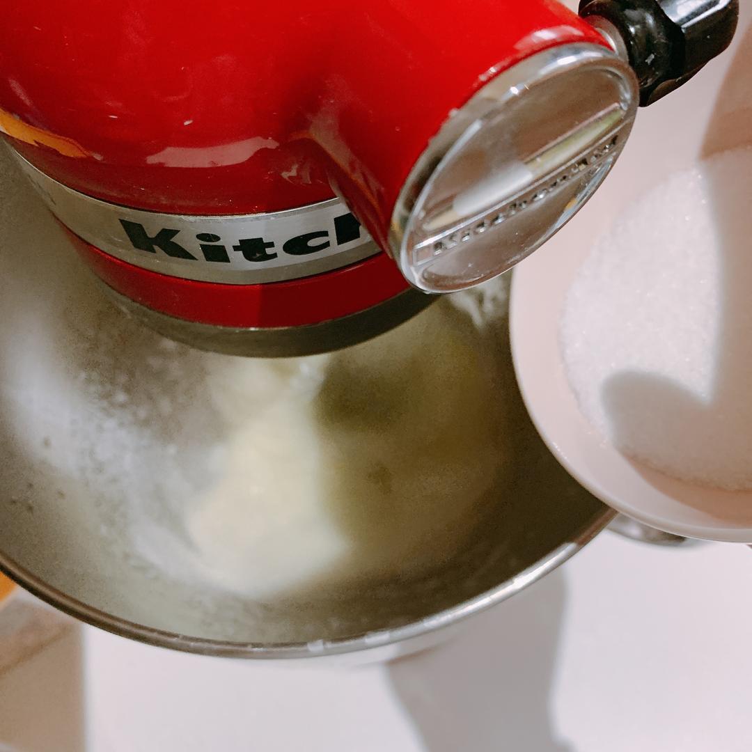 蛋清放入厨师机桶中,分三次倒入细砂糖(同时预热烤箱170℃)