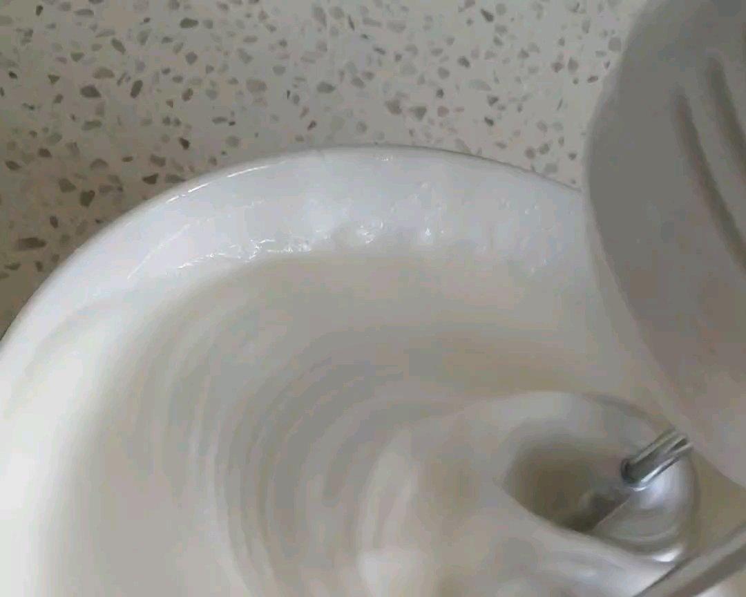 【打发蛋清】 蛋清内加入两滴白醋去腥,加入10克玉米淀粉(不加也可),用打蛋器进行打发,在打发过程中,30克白糖分三次加入蛋清。当打发的蛋清提起打蛋器事有小尖角即可。