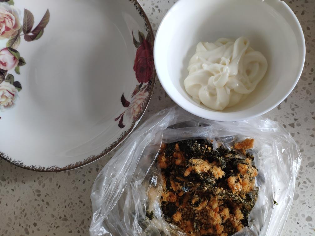 【 准备配料】 在烤蛋糕的同时,将沙拉酱挤入碗中。将海苔放入袋子捏碎,加入肉松和熟芝麻,准备好一个干净无水的盘子。