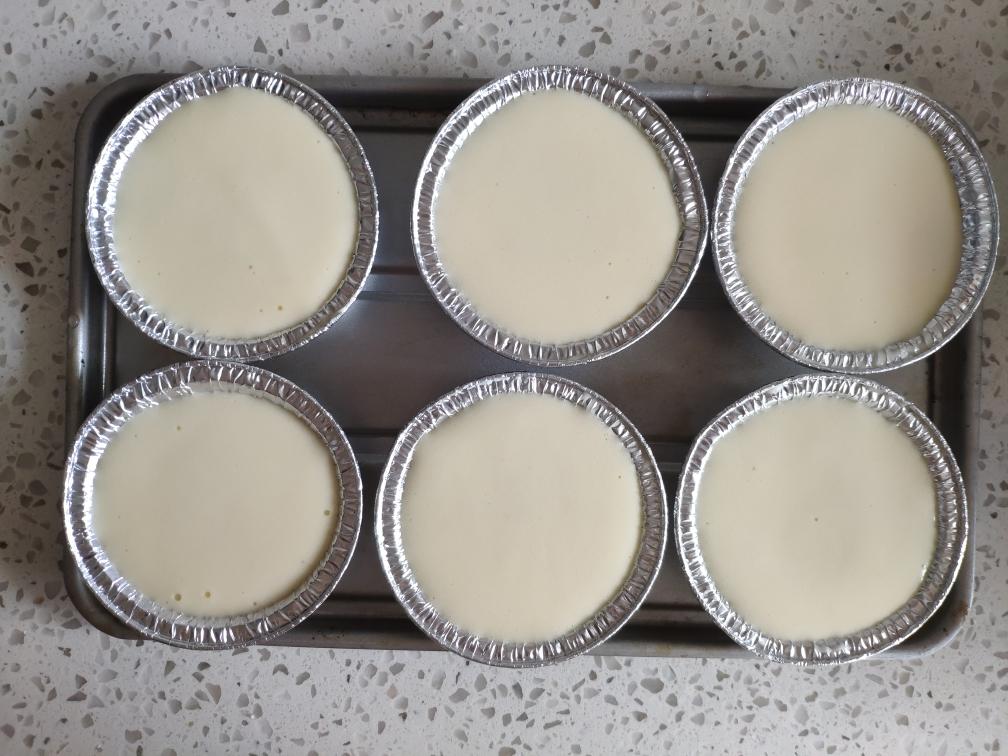 【入模开烤】 将蛋糕液倒入蛋挞模具中,烤箱180度烤20分钟。